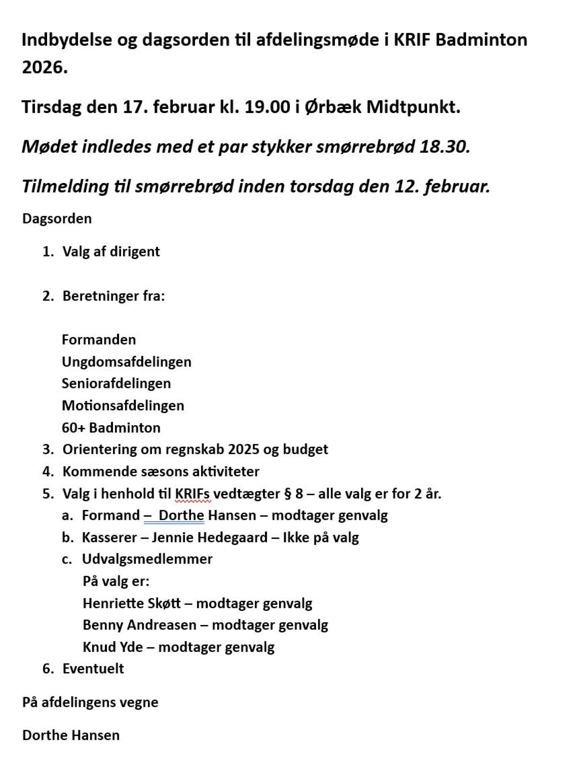 Tilmelding til spisning kl. 18.30 inden afdelingsmødet starter kl. 19.00